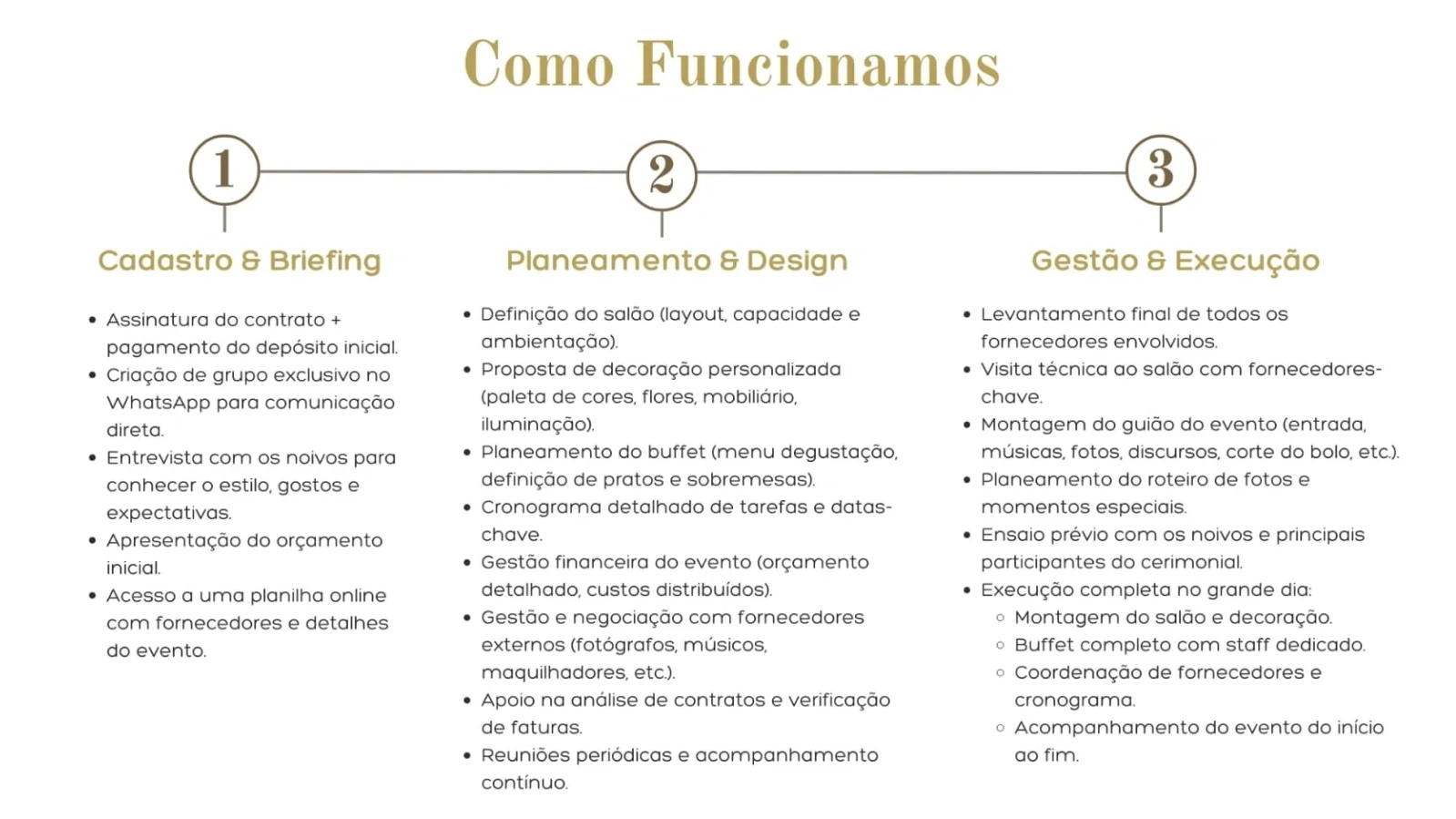 A nossa missão é transformar cada celebração em uma experiência única, realizada com elegância, criatividade e atenção total aos detalhes. Acreditamos que todo casal merece viver o casamento exatamente como sempre sonhou — sem limitações, com soluções personalizadas e um serviço que coloca o cliente no centro de cada decisão.